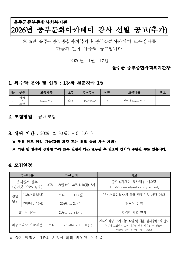 2026년 중부문화아카데미 강사 선발 공고(추가)