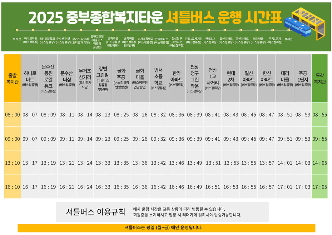 셔틀버스는 평일 (월~금)에만 운영됩니다.