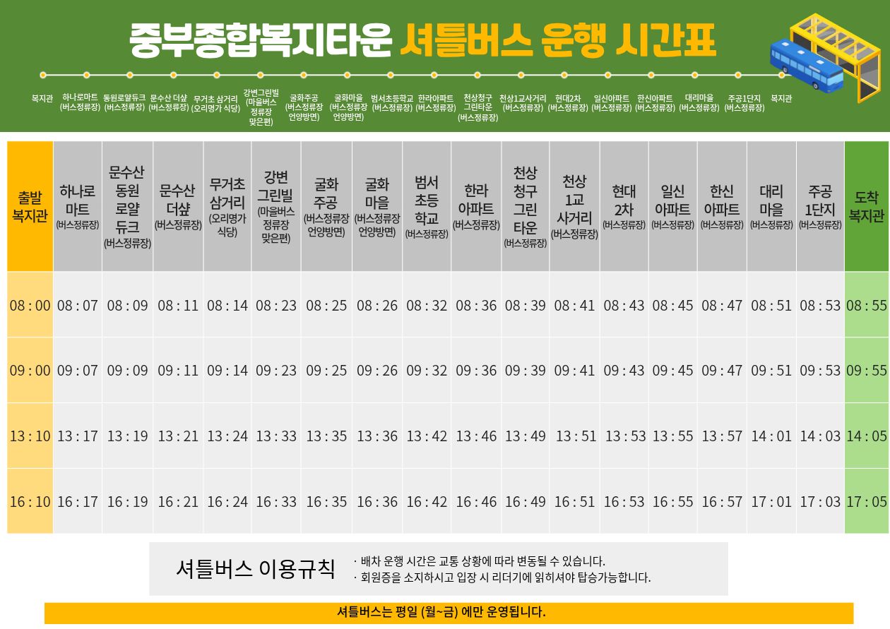 셔틀버스는 평일 (월~금)에만 운영됩니다.