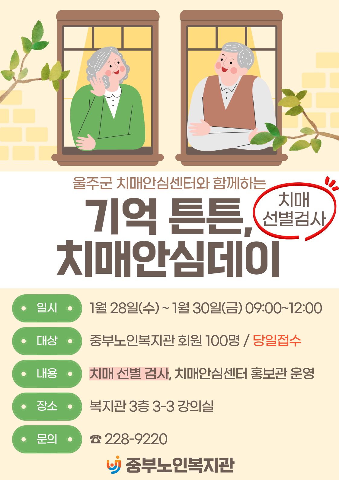 치매 선별 검사와 치매안심센터 홍보관이 진행될 예정이니 많은 참여 부탁드립니다!