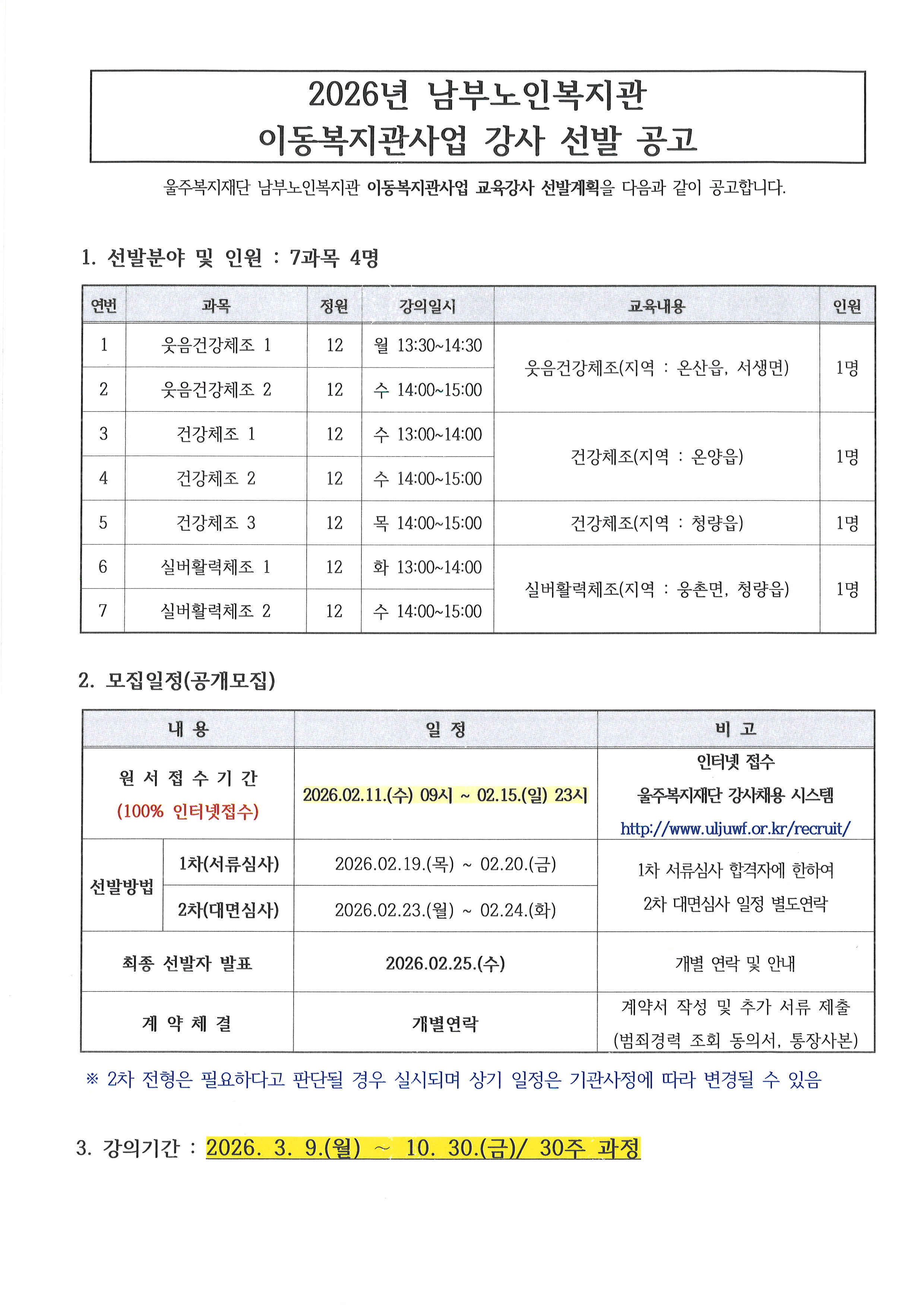[남부노인복지관]2026년 남부노인복지관 이동복지관사업 강사 선발 공고