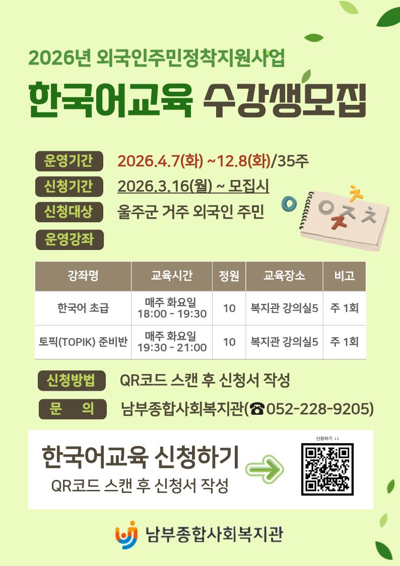 2026년 외국인주민정착지원사업 한국어교육 수강생 모집