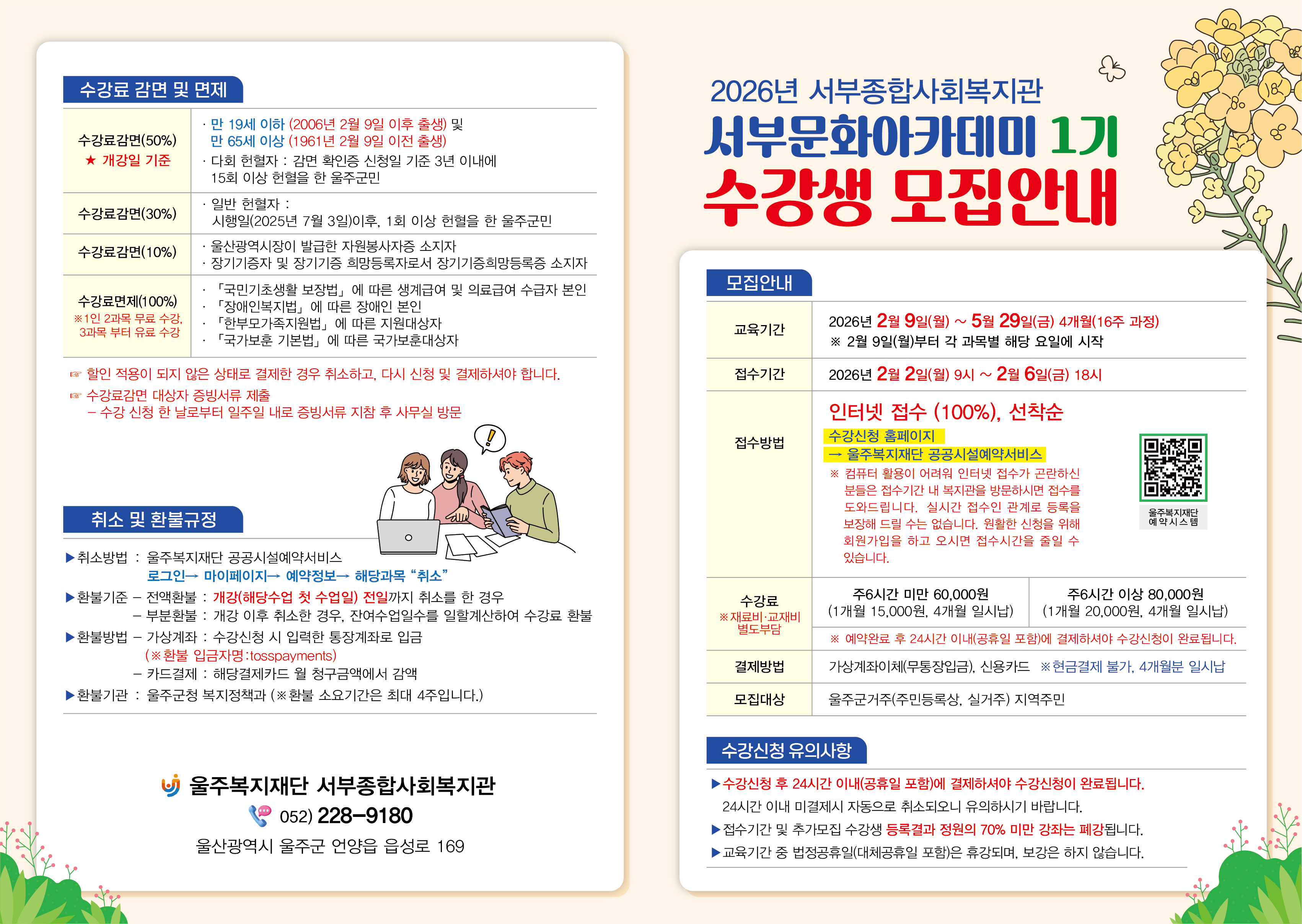 ► 수강신청은 서부종합사회복지관 홈페이지가 아닌 "울주복지재단 공공시설예약서비스"에서 가능합니다.