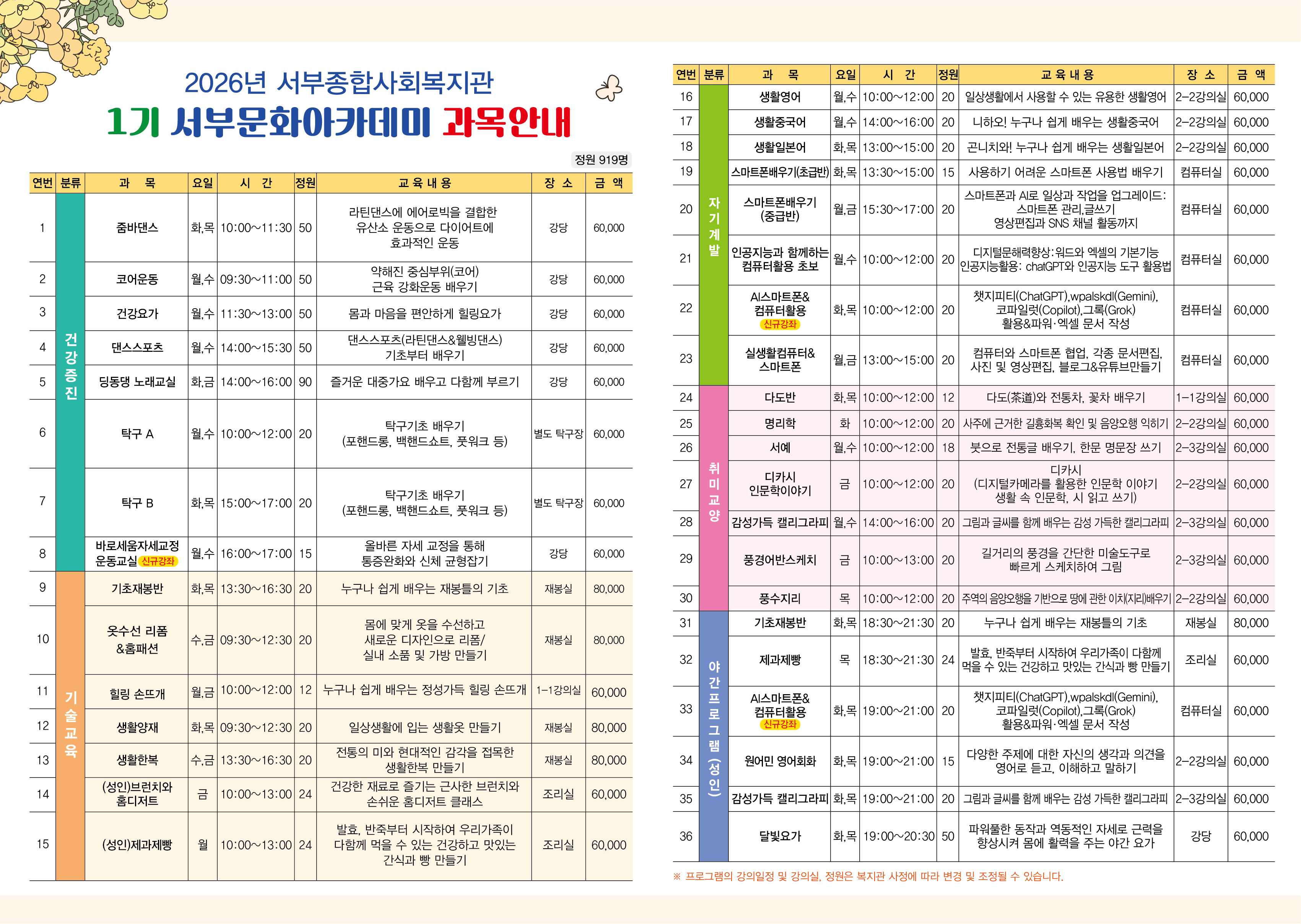 *개강 후 잔여석이 있는 강좌나 취소자 발생으로 잔여석이 발생하는 경우 추가 접수 문의는 복지관으로 전화주세요.