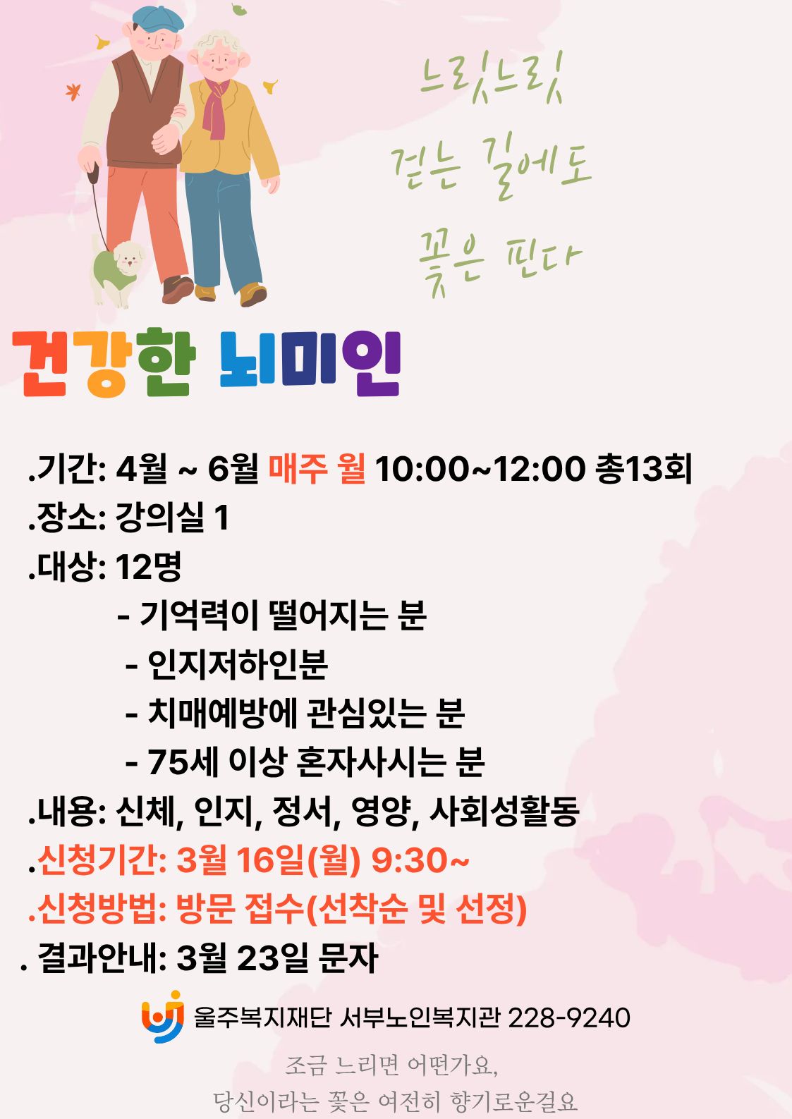 인지활동이 필요한 어르신을 대상으로 치매예방 건강한 뇌미인 프로그램을 진행하고자 합니다.